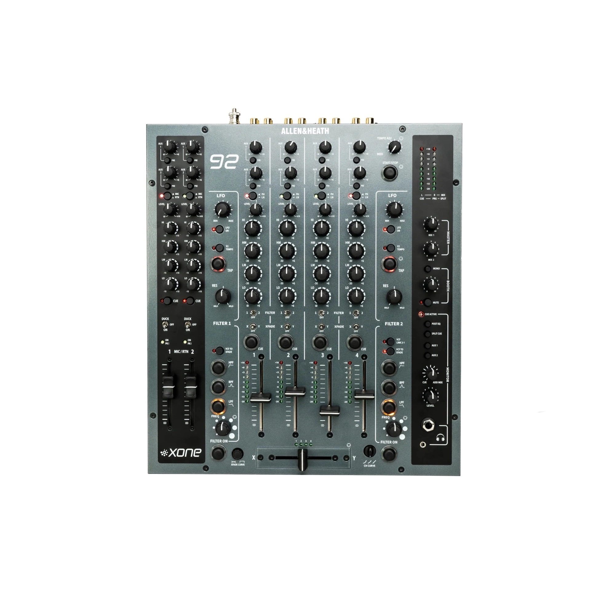 Thanks to enhanced RIAA preamps, analog aural aesthetics abound, with variable Phono and Line operations selectable for each channel. While four channels offer an extensive range of multi-source madness, the Xone:92 Mk2’s dual auxiliary channels and MIDI output expand your sonic aperture to include countless opportunities to incorporate drum machines, synthesizers, sequencers, and more. On each of the four master channels, the levels of both Aux channels can be independently adjusted from full-kill to +6dB, and they can be toggled for pre-send/return loop playback. Furthermore, the Aux options offer Allen & Heath’s hallmark 4-band EQ, in addition to send/return and level controls, all of which you can control outside of each Aux’s presence within a master channel. Plus, using the 5-pin MIDI output, you’re able to send real-time clock and system commands, in addition to CC signals, giving you access to highly synchronized performances across multitudes of mixers and instruments, as well as exceptionally musical control of filter frequencies and crossfader position. When the beat demands it, the Tap Tempo gives you a streamlined pass to instantly align your external gear with the pre-recorded track you’re playing or queueing.