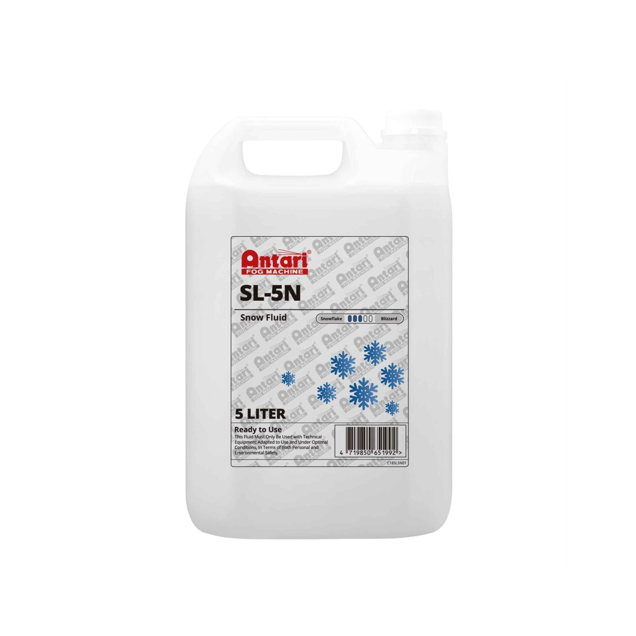 Antari SL-5N is a 5-liter, water-based, and 100% biodegradable, high-quality snow fluid designed to produce finer, lighter, and drier snowflakes compared to the standard SL-5 formula. It is suitable for both indoor and outdoor applications, offering faster dissipation with minimal residue on the floor.