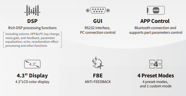 | Equalizer | 5bands Music, 12bands Mic, 6bands Output L/R |