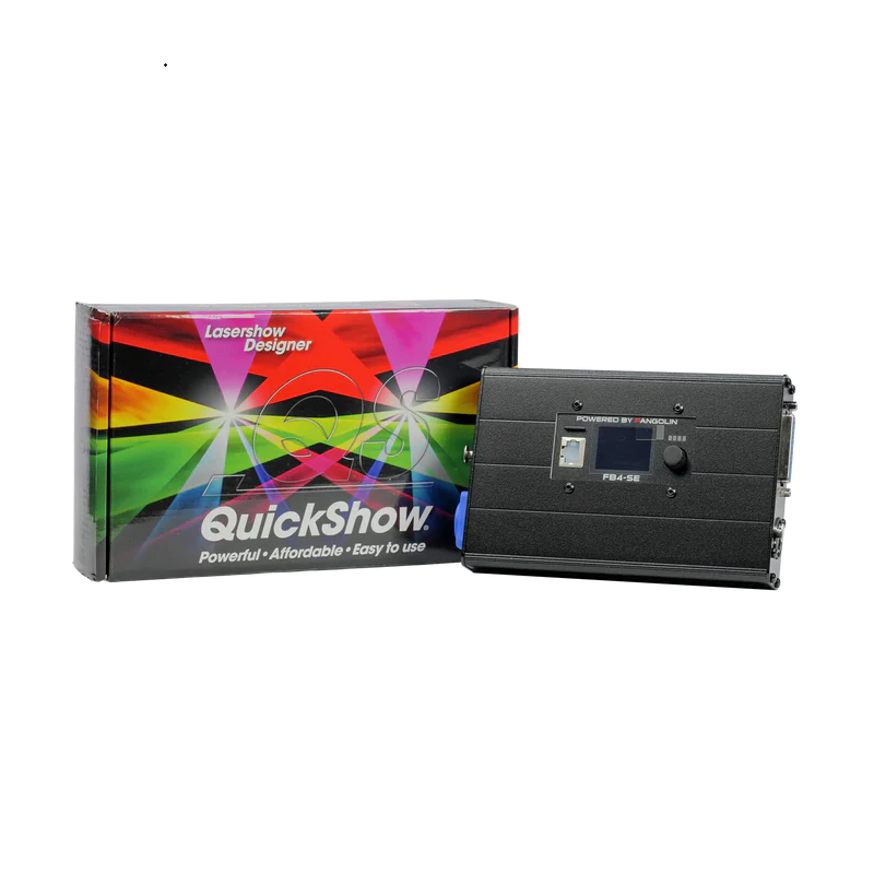 FB4 External features our FB4 DMX control hardware inside of a custom housing, giving you complete control from a PC, lighting console (using DMX or ArtNET), or in Auto Mode. FB4 External includes our award-winning laser control software QuickShow completely free, providing you with over 2,000 pre-programmed laser cues, and all the tools you need to create your own custom laser content.