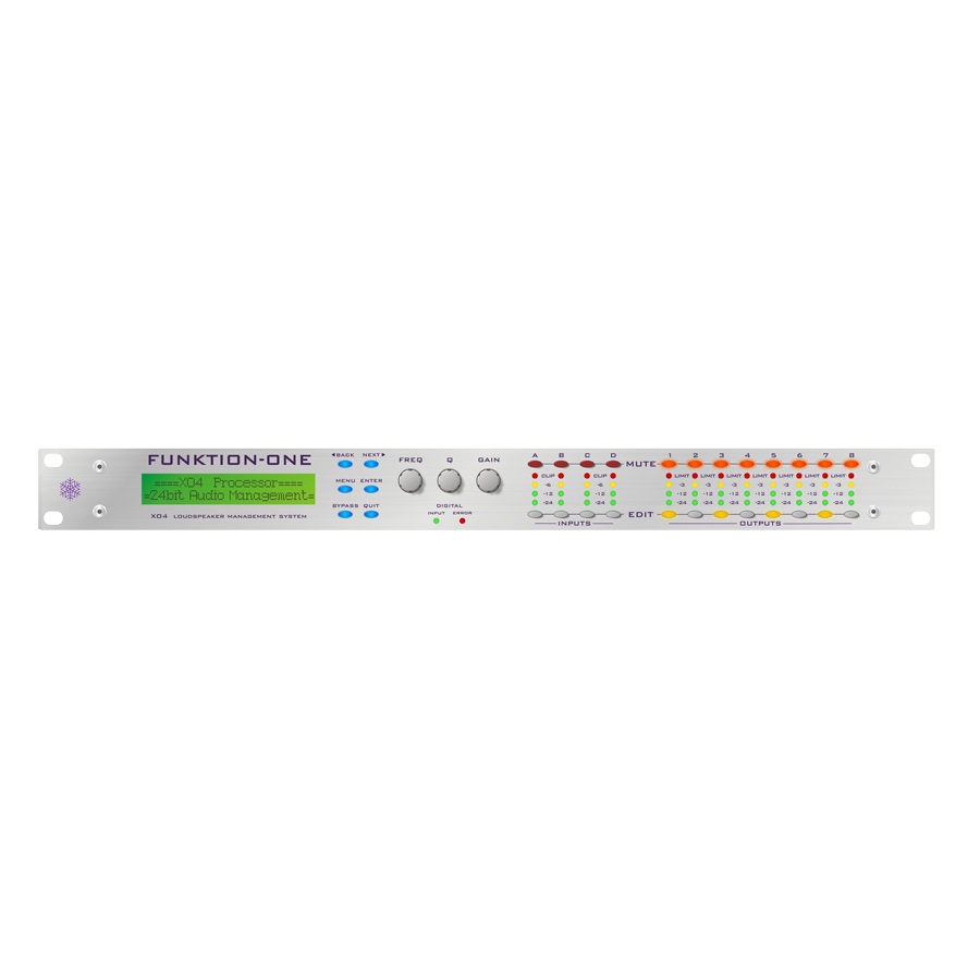 The Funktion One XO4 / XO4A is a 4-in 8-out audio management system designed and manufactured to Funktion-One’s specifications by XTA. The XO4A offers advanced processing capabilities and improved performance along with extra features as standard. The XO4A’s native processing runs at 96K, resulting in wider bandwidth (over 30kHz), and its high-performance converters provide low noise and improved distortion figures. Audiocore capability enables control of us to 32 processors remotely via 3-pin XLR standard signal cable.