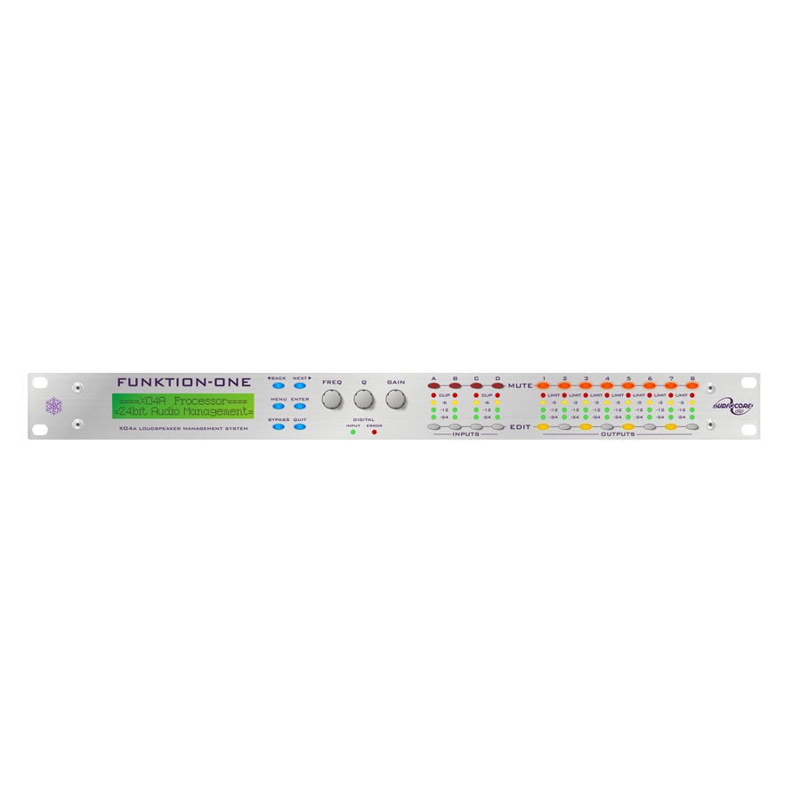 The Funktion One XO4 / XO4A is a 4-in 8-out audio management system designed and manufactured to Funktion-One’s specifications by XTA. The XO4A offers advanced processing capabilities and improved performance along with extra features as standard. The XO4A’s native processing runs at 96K, resulting in wider bandwidth (over 30kHz), and its high-performance converters provide low noise and improved distortion figures. Audiocore capability enables control of us to 32 processors remotely via 3-pin XLR standard signal cable.