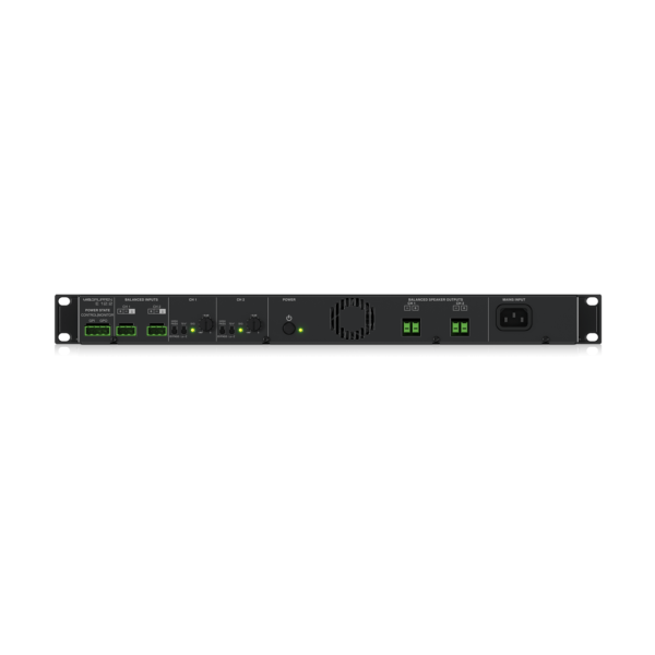 • 1,200 W amplifier carrying 2 flexible output channels in a high power density 1 rack unit form factor saves rack space and system cost