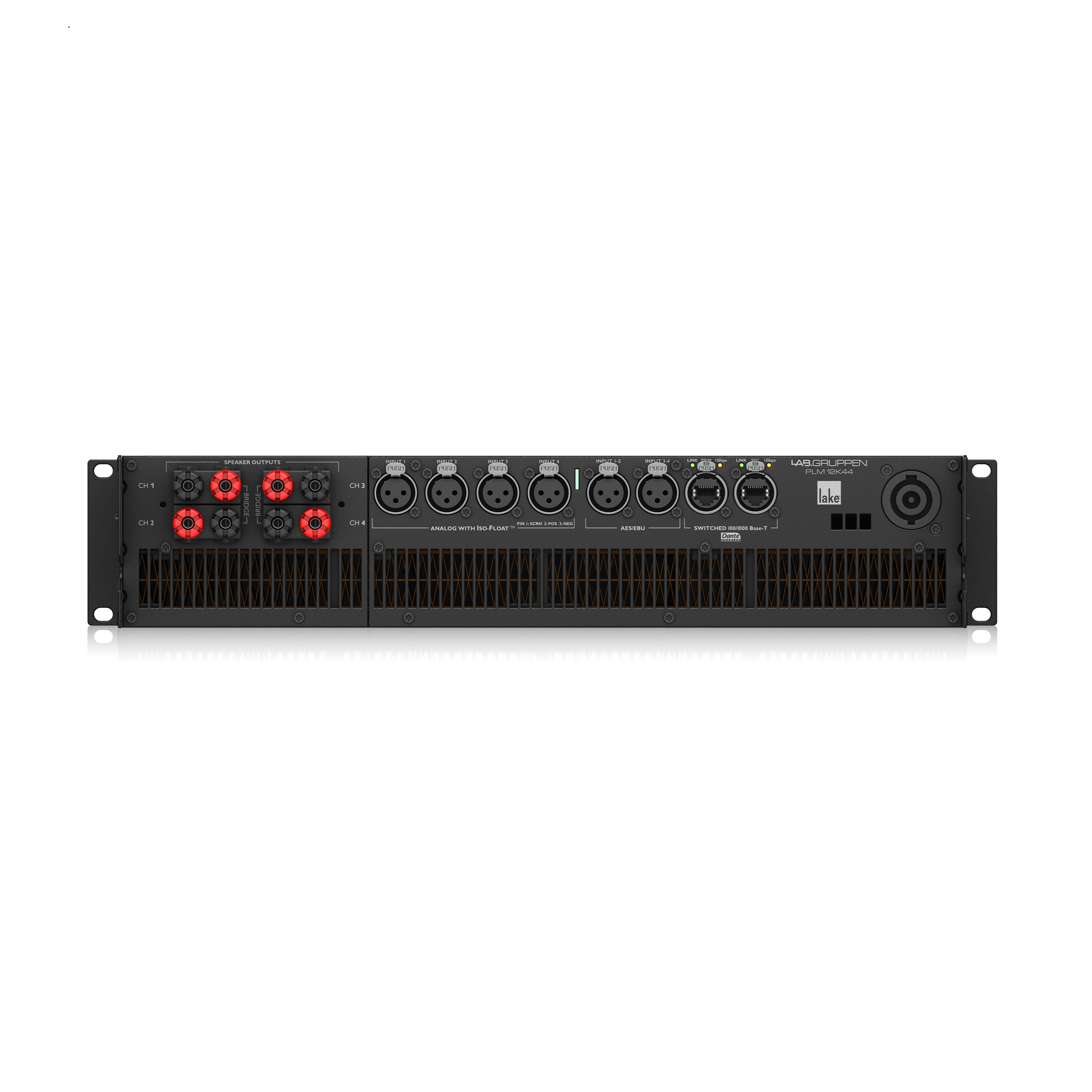 The PLM 12K44 features the legendary power of exclusive Lake Processing algorithms, incorporating four full-featured Lake modules with four discrete channels of audio throughput input to output. Audio signals are selectable from four channels of analog (with Iso-Float ground isolation), four channels via AES3 digital inputs and eight dual redundant Dante networked digital inputs. Input signals are individually selectable for each channel, with programmable failover to a lower prioritized input.