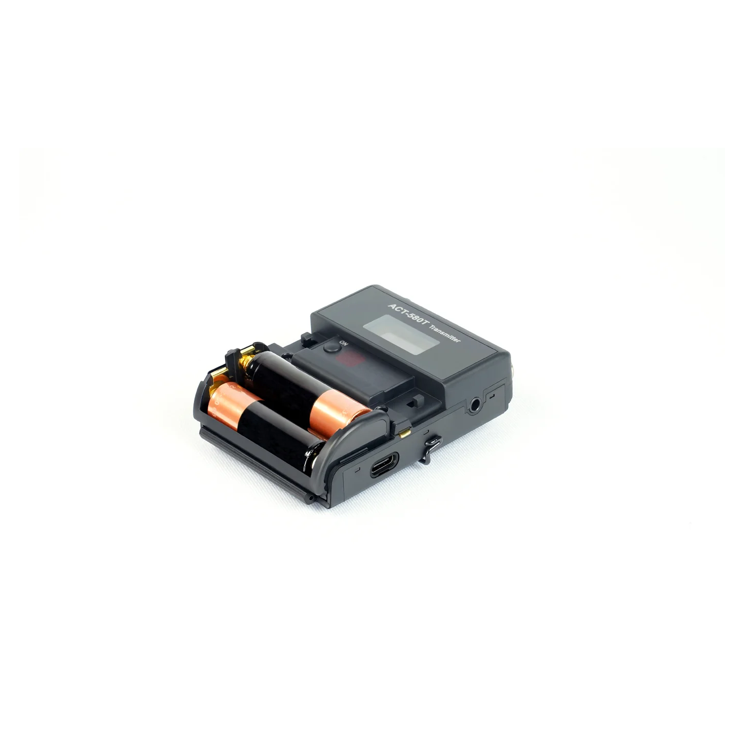 The ACT-580T is a compact 5.8 GHz digital bodypack transmitter with a metal belt clip and USB-C charging, supporting AA or 18500 Li-ion batteries. It works with lavalier and headworn microphones to deliver 48 kHz / 24-bit, interference-free audio for speeches and performances.