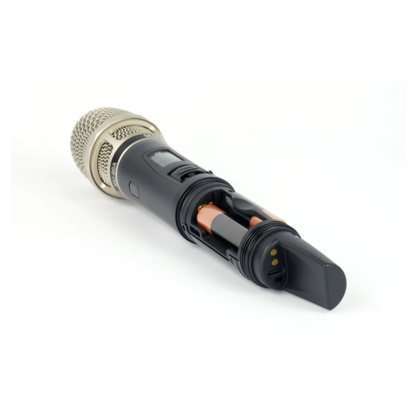 The ACT-700H is a UHF analog wideband handheld transmitter with a metal housing, low handling noise, and MIPRO’s patented multifunction control module. It supports interchangeable condenser and dynamic capsules and offers AA or 18500 Li-ion battery operation with USB-C charging, making it suitable for professional stage use.