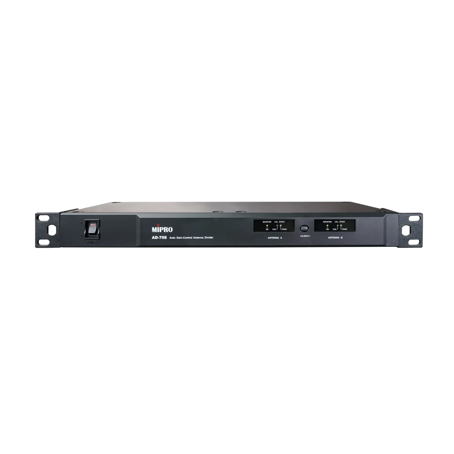The AD-708 is a UHF 4-channel antenna divider that distributes two antenna inputs to four receivers, streamlining antenna setup and maintaining stable RF performance. It features automatic gain calibration and signal monitoring, and works with antenna boosters in multi-receiver systems.