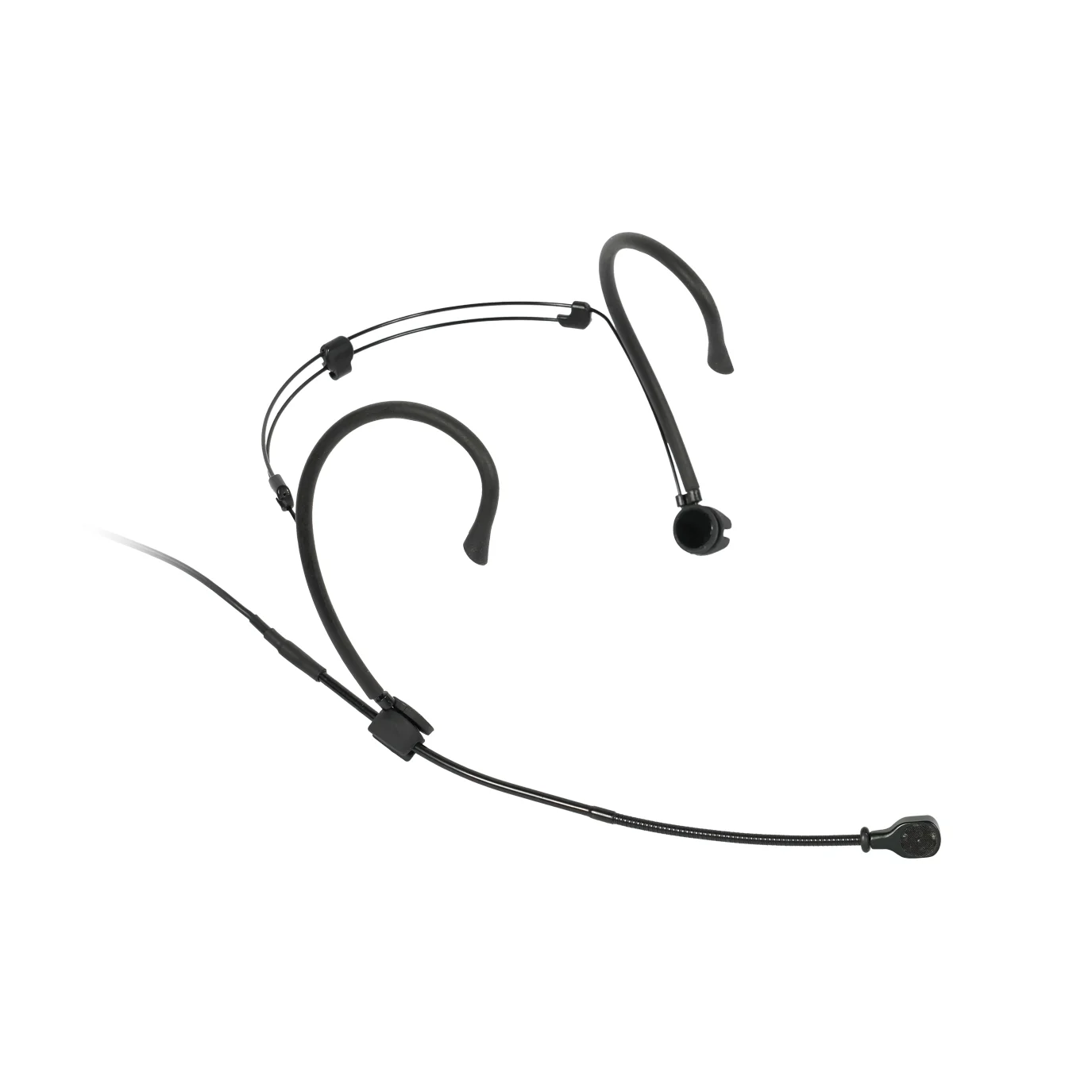 Black cardioid headworn microphone featuring precise directionality for strong noise and feedback suppression. Designed with a stable, comfortable fit for stage performance, fitness instruction, and vigorous movement.