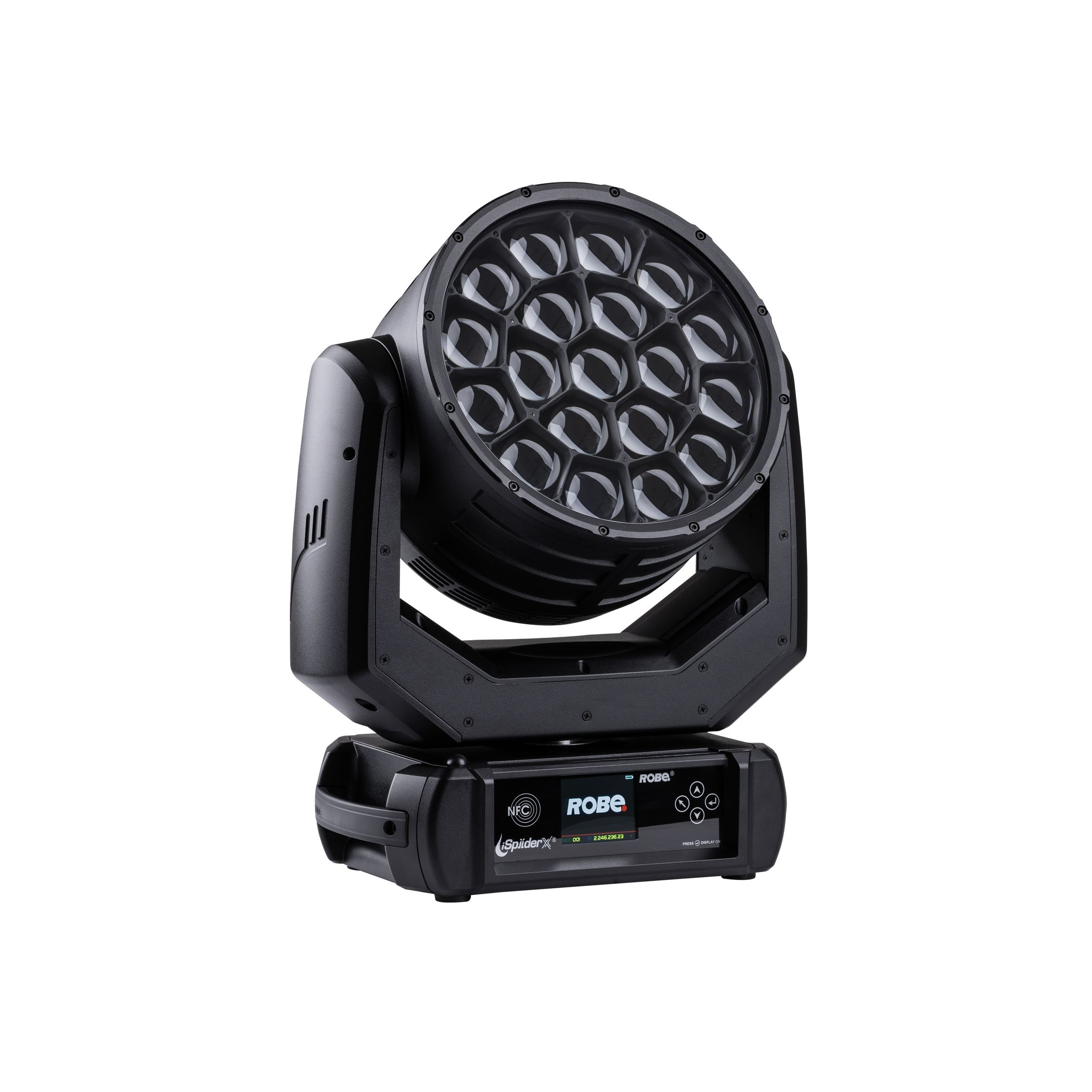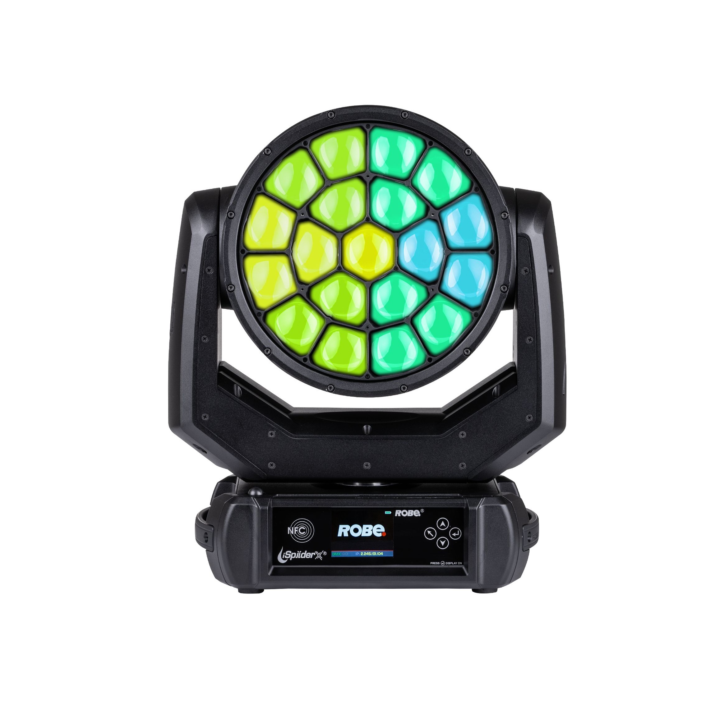 Equipped with 18 × 40-Watt RGBW and 1 × 60-Watt LED multichip sources, the iSpiiderX® maintains the core specifications of the original Spiider®. Its 12.5:1 zoom optical system delivers a versatile range from a tight 4° Beam to a wide 50° Wash, retaining full pixel mapping capability.