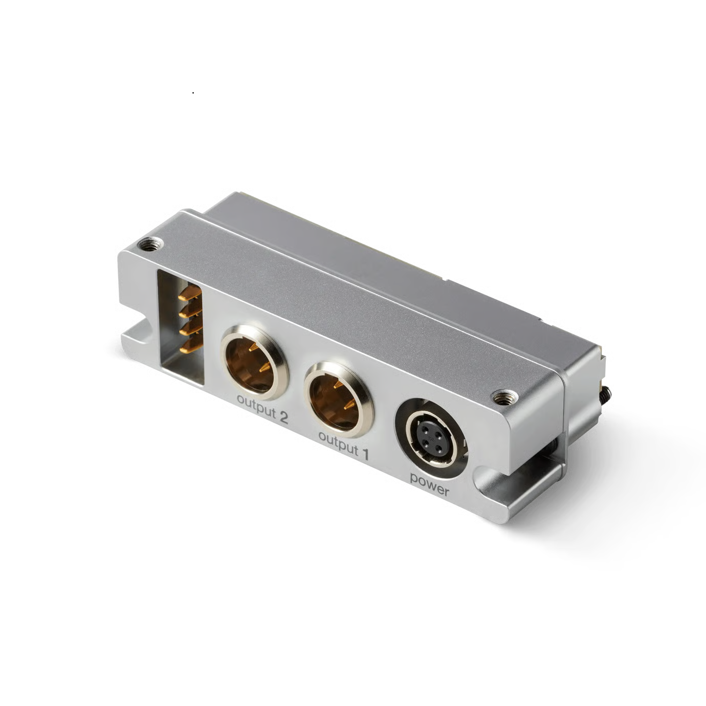 One of the major advantages of the slot-in wireless receiver form factor is that they can be configured for multiple applications, including insertion into a camera or multi-coupler device, or for standalone use where power is provided by a battery distribution system (BDS) or battery sled. The ADX5BP-TA3 Backplate provides stand-alone connectivity for the Axient® Digital ADX5D into professional broadcast cameras, multi-coupler devices, and battery distribution systems (BDS). It includes a 4-pin connector for mating with a Shure battery sled, two TA3 (mini 3-pin XLR) audio output connectors, and a 4-pin locking Hirose power input connector. Captive Phillips-head screws provide simple installation to the ADX5D. Providing two channels of audio output, ADX5BP-TA3 Output 1 and 2 are both analog. However, Output 1 can be configured for digital AES3 output in the device menu (analog Output 2 is disabled when AES3 is selected).