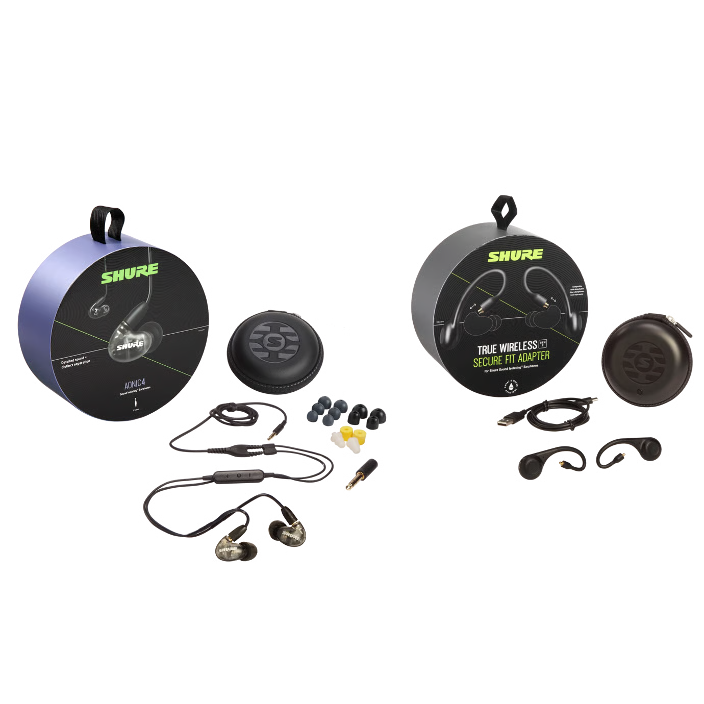 Dual-driver hybrid earphone design for detailed sound + distinct separation of musical elements. Go from wired to wireless in this complete bundled solution that includes the AONIC 4 Detachable Sound Isolating™ Earphones, a wired RMCE-UNI communication cable and the True Wireless Secure Fit Adapters, Gen 2.