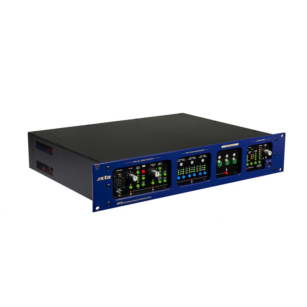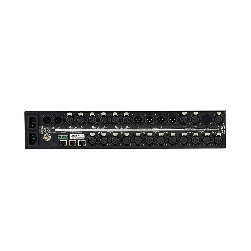 The MX36 handles 36 inputs in a sleek 2U format, across analogue, AES, and Dante sources – These are arranged in sets of four (to typically support Left-Right-Front Fill and Sub feeds from an individual console).